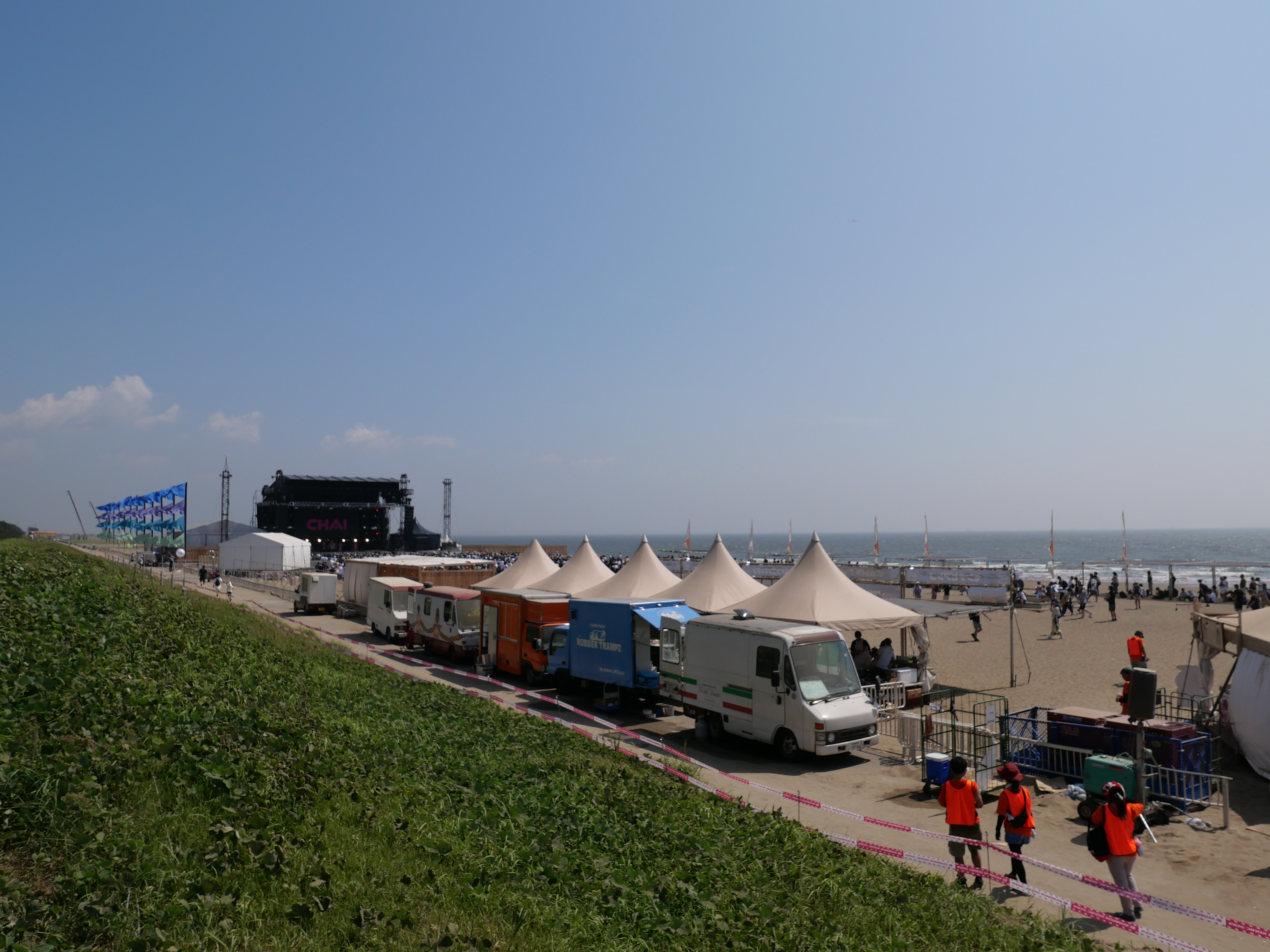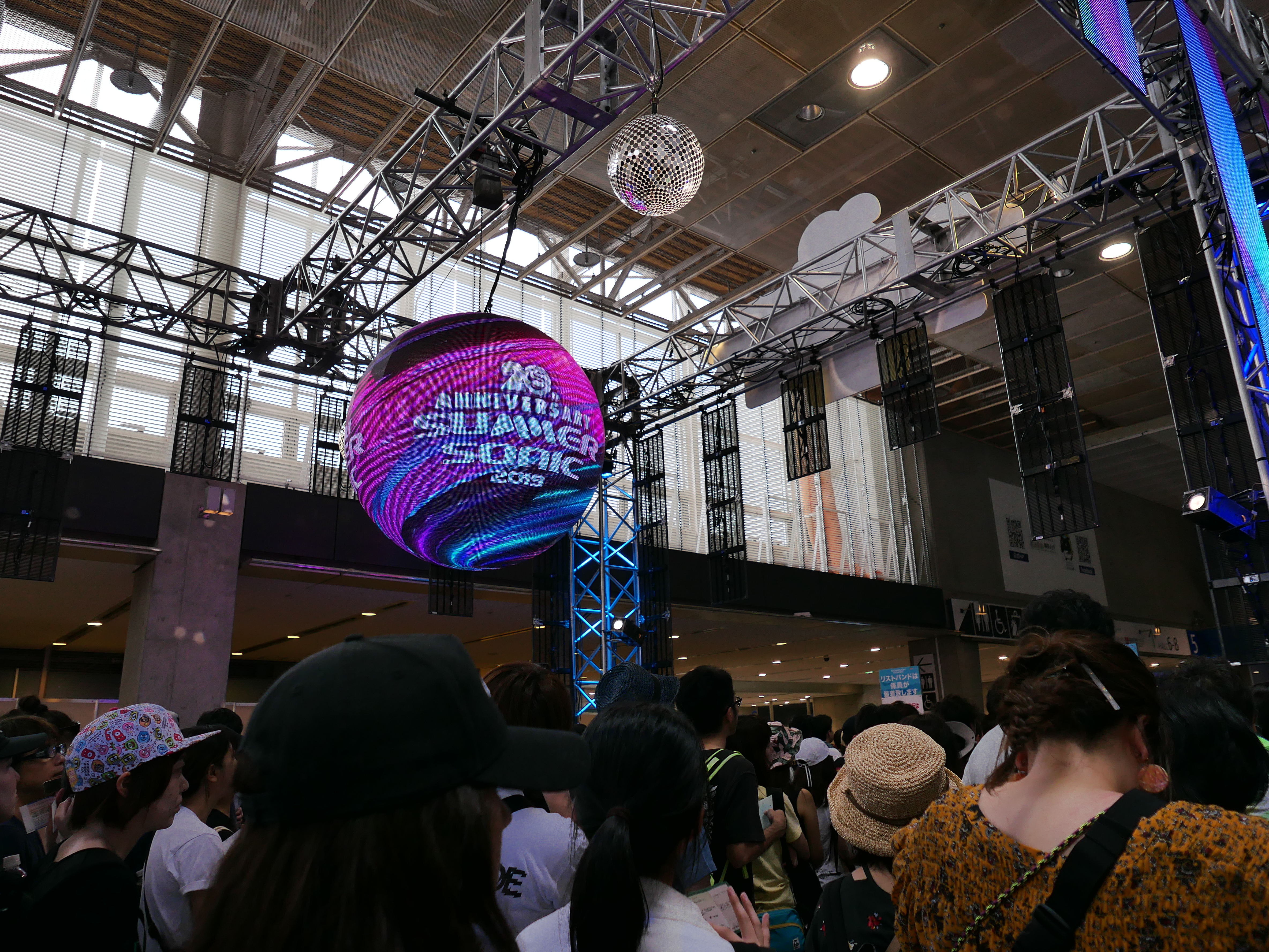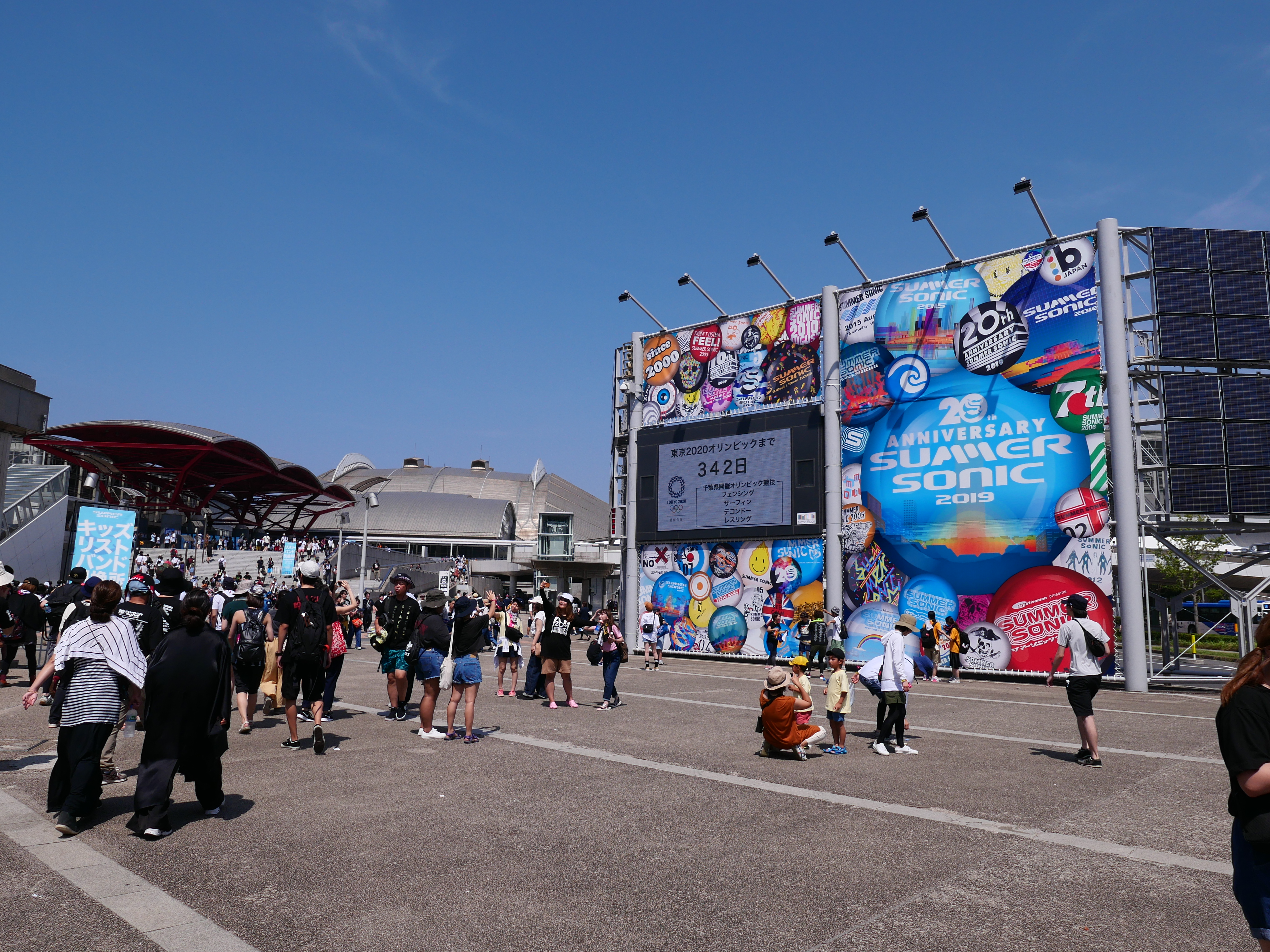 先大概介紹場地。SS的會場涵蓋兩大區塊,一個是離JR佔較近的幕張Messe會展中心;另一個則是旁邊靠海的棒球場Zozo Marine Stadium到旁邊沙灘圍起的一整塊較大的區域組成。為了管理進出,兩個會場都各只有一個出入口,因此兩邊來回的動線單程走路可能要20分鐘,而主辦方則有安排免費接駁巴士。慕張Messe整個活動區域幾乎都為室內,是在炎炎夏日躲避陽光看表演的好選擇;裡面的Mountain、Rainbow、Sonic三個室內舞台各別都能容納數千人規模;中間有一塊很大的室內餐飲攤販與用餐區,旁邊包圍著像鐵三角等合作廠商攤位,而兒童區、Silent Disco Party的場地也位在這個區外內。