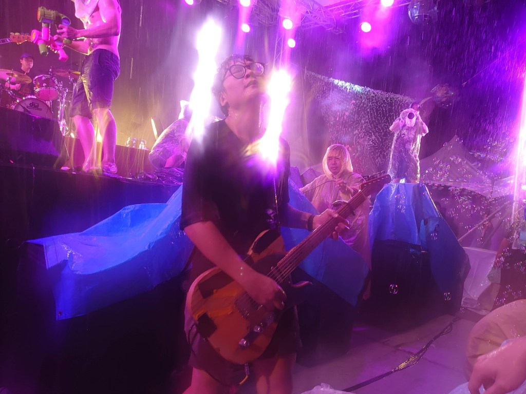 而去年的海湧祭演出,再度讓我被拍謝的演出所感動。話說海湧祭已經辦了兩屆、位在基隆八斗子的在地小型音樂節,總是不意外的遇到大雷雨;去年的雨勢則又遠勝於第一屆,不間斷的打雷閃電,雨下到雨衣擋不住、內外盡濕,視線模糊不清。即將在晚上壓軸的拍謝,在彩排時卻面臨到,因為大雨導致維尼的整盤效果器沒辦法運作;儘管如此,拍謝當下仍決定維持演出,維尼在這40分鐘的演出中,完全展現了他獨特的吉他英雄風範,直接以電吉他原音現場刷好刷滿,也不畏雨勢、直接帶著吉他跳下舞台,卯盡全力solo,完全不因大雨而保留演出誠意。
