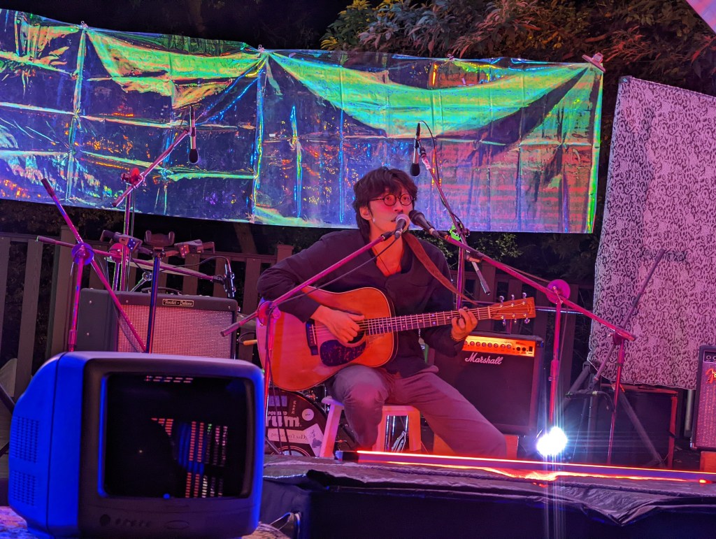 而隔一周,位在北藝大後面的荒山劇場,deca joins的主唱鄭敬儒一人一把吉他演出,cover了草東尚未收錄在專輯的歌曲<床>,把原本現場演出偏輕快節奏的編曲,改為用自己人聲透過效果器層層堆疊出溫暖緩和的旋律,帶著嗚咽唱著: